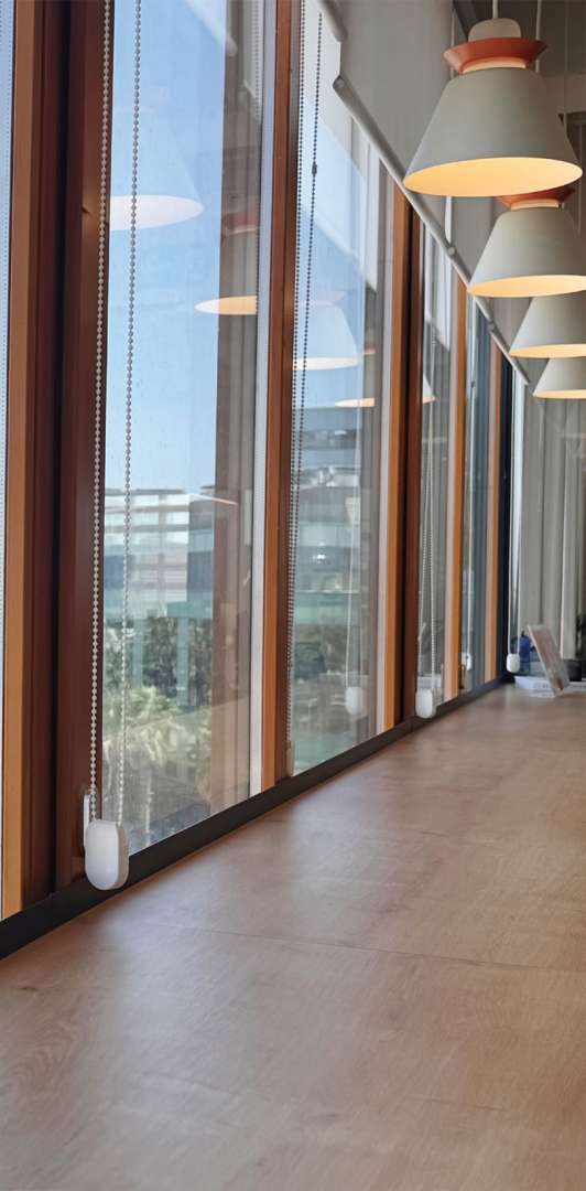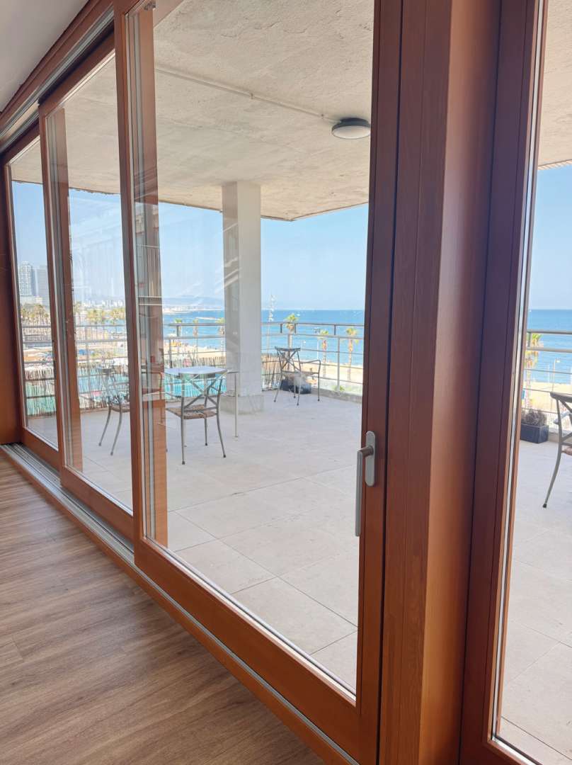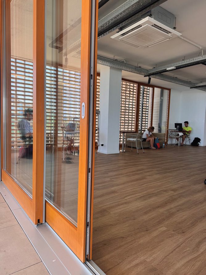 L'opció escollida per al projecte va ser la sèrie ROI Plus 70.3, en pi laminat envernissat a l'aigua i el color translúcid. "Es va escollir aquest sistema perquè ofereix gran estabilitat, un element clau quan es treballa amb corredisses de grans dimensions, que requereixen moltíssima precisió en la seva instal·lació i tancament. També es van incorporar peces en 90.3, sempre en fusta laminada", indica Roig. En estar instal·lades en un entorn litoral, calia que les finestres poguessin resistir sense alteracions les condicions d'humitat i salinitat: “Aquestes fustes ja compten amb un tractament especial que les protegeix davant d'aquests entorns, amb l'aplicació de diverses capes insecticides, fungicides i bases. un complet estudi del projecte en què es va ajustar el tipus de pintura i color a emprar per garantir la durabilitat i resistència necessàries. La pintura es fabrica a la nostra fàbrica, seguint sempre els paràmetres establerts i auditats pels tècnics de Remmers. En el projecte es van fer servir prop de 150 finestres, en les diverses tipologies ja esmentades: fixes, practicables i corredisses, moltes d'entre 3 i 6 fulles, de grans dimensions. La planificació i coordinació de la fabricació, lliurament i instal·lació va ser molt precisa, com indica Josep Roig: "Una vegada definit el projecte, vam marcar els temps de producció. En primer lloc, subministrem els premarcos en obra. A continuació, els nostres tècnics van coordinar els lliuraments per fases i altures (l'edifici, incloent la planta baixa, comptava amb cinc plantes a la façana Est i 6." Per complir amb les exigències d'aïllament tèrmic i acústic, l'envidrament de les finestres va fer servir vidre cambra sota emissiu, en la composició següent: 8+8 acústic / 20 argó / 6+6 acústic. A més, per garantir les altes prestacions del conjunt de tancaments, es va optar per ferramentes Roto Frank, en concret el sistema oscil·lobatent NX Timber per a les finestres fixes i Patio Lift per a les corredisses elevables. "Fa molt de temps que treballem amb Roto, sobretot des que comptem amb les nostres línies de producció automatitzades. Apostem per la marca per la seva fiabilitat i per l'absència d'incidències. En finestres com les que utilitzem en aquest projecte, amb pesos tan importants, no ens podem permetre cap errada, per això es necessita la millor ferramenta possible. de la finestra”.