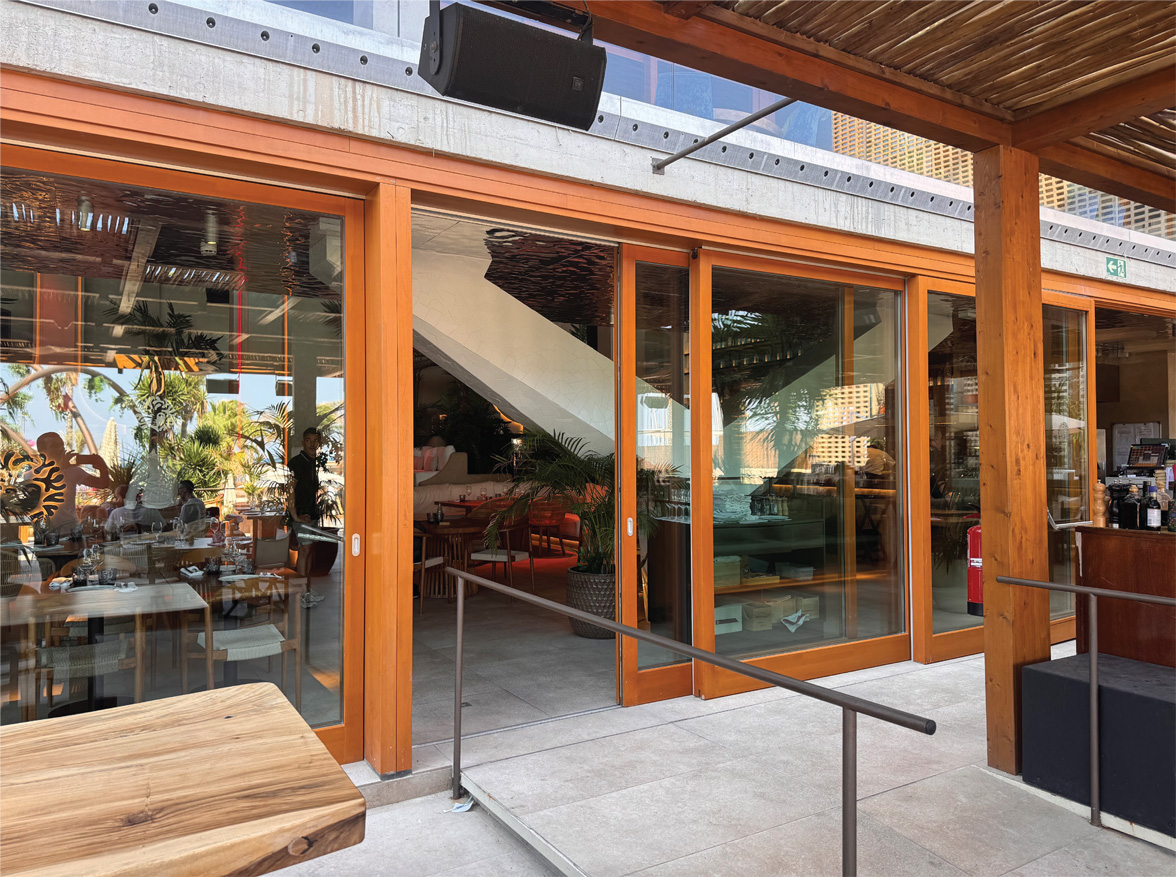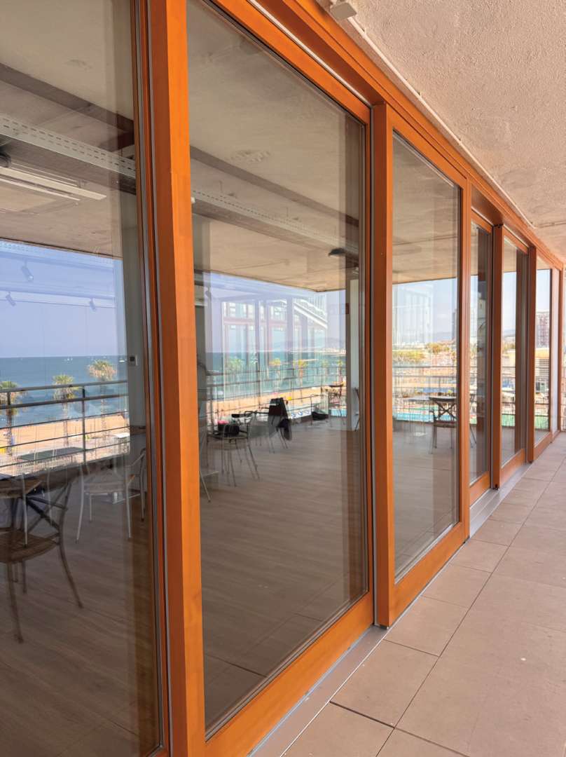 Dos exemples de les noves finestres corredisses instal·lades a la renovació del CNB (esquerra) i al nou 'beach club' Bastian Beach Barcelona (dreta). Aquests sistemes empren el sistema Pati Lift de Roto FTT, subministrat en aquest projecte per Simatec.